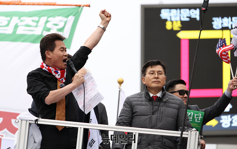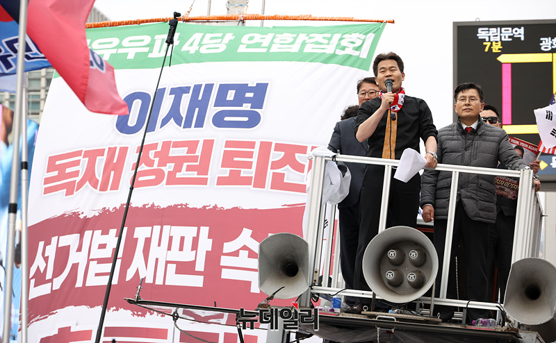 전한길 전 한국사 강사가 1일 오후 서울 중구 세종대로에서 열린 자유우파 4당 연합집회에서 구호를 외치고 있다.