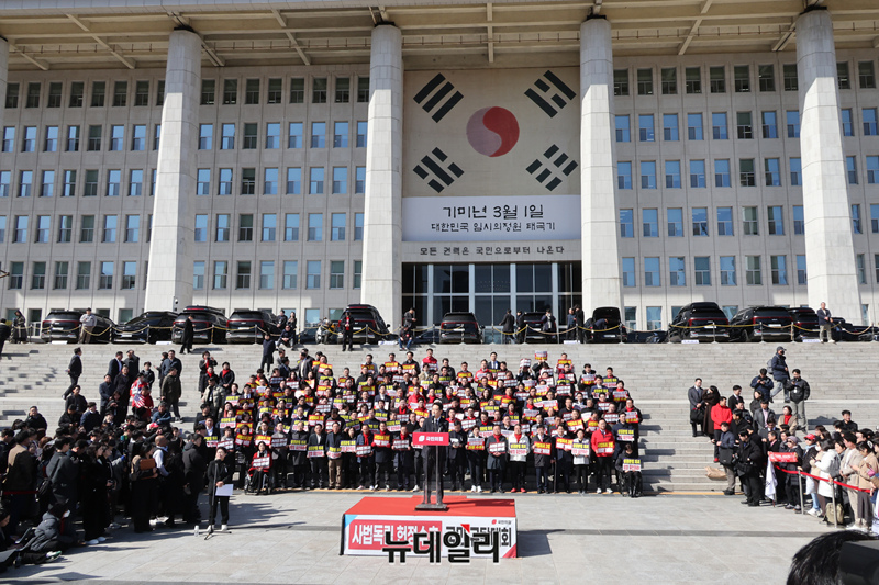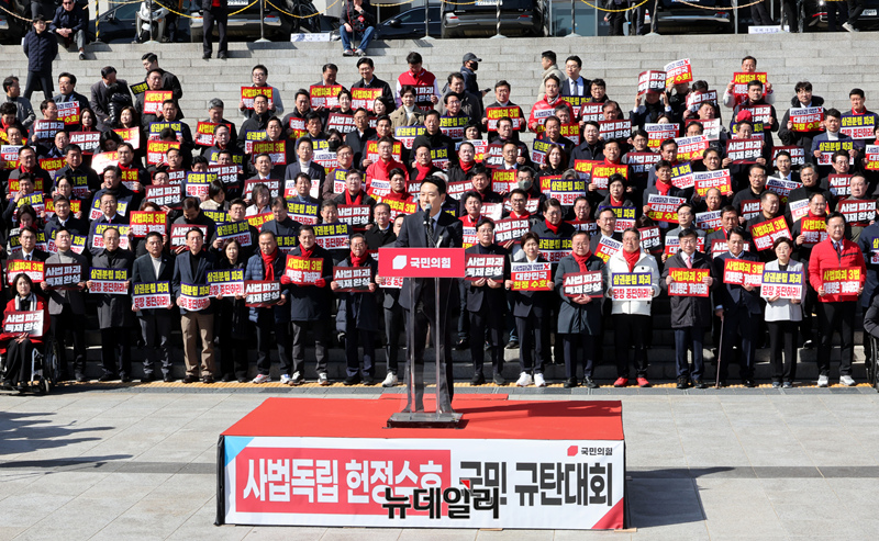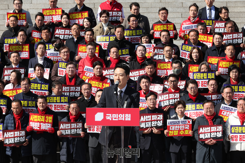 장동혁 국민의힘 대표가 3일 국회 본관 앞에서 열린 사법독립 헌정수호를 위한 대국민 호소 국민대장정 규탄대회에서 출정사를 하고 있다.