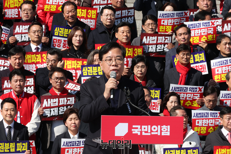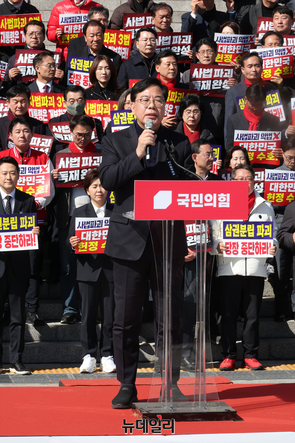 송언석 국민의힘 원내대표가 3일 국회 본관 앞에서 열린 사법독립 헌정수호를 위한 대국민 호소 국민대장정 규탄대회에서 발언을 하고 있다.