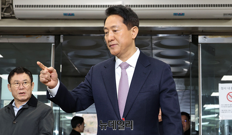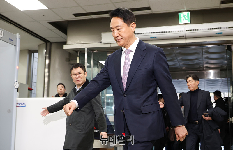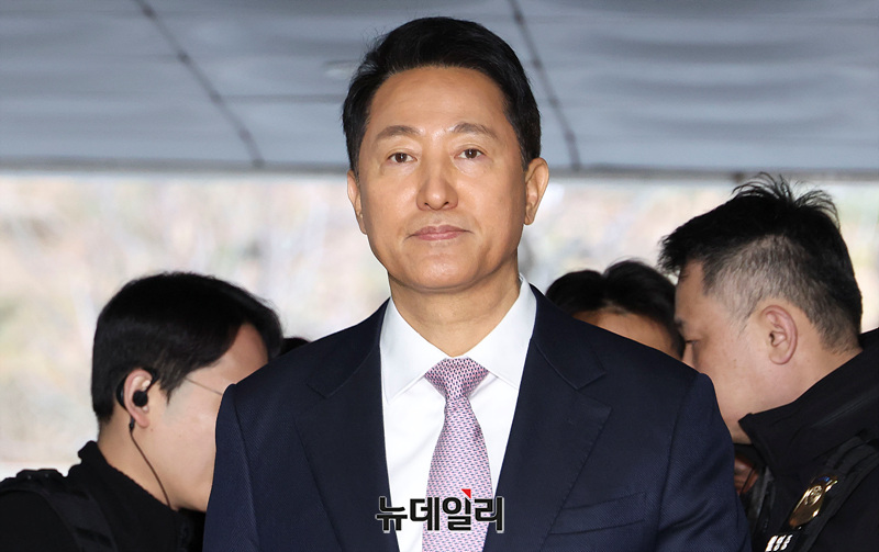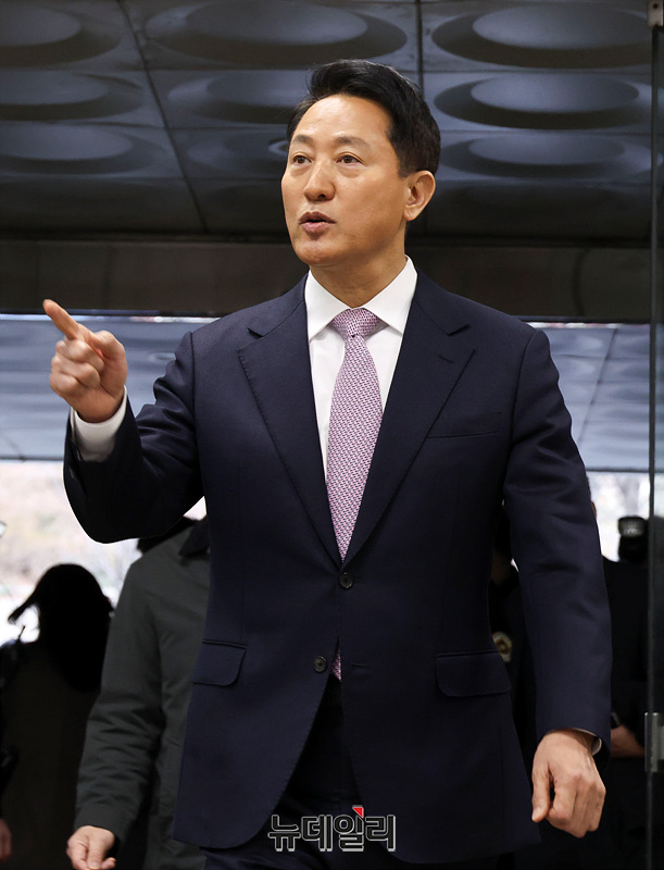 '명태균 여론조사 의혹'으로 불구속 기소된 오세훈 서울시장이 4일 오전 서울 서초구 서울중앙지방법원에서 열린 정치자금법 위반 첫 공판에 출석하고 있다.