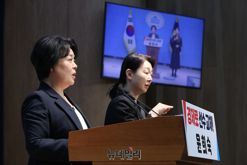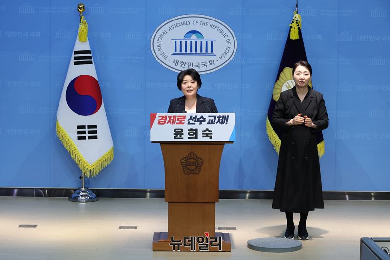윤희숙 전 국민의힘 혁신위원장이 4일 오전 국회 소통관에서 서울시장 후보 출마 기자회견을 하고 있다.