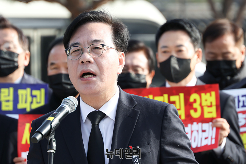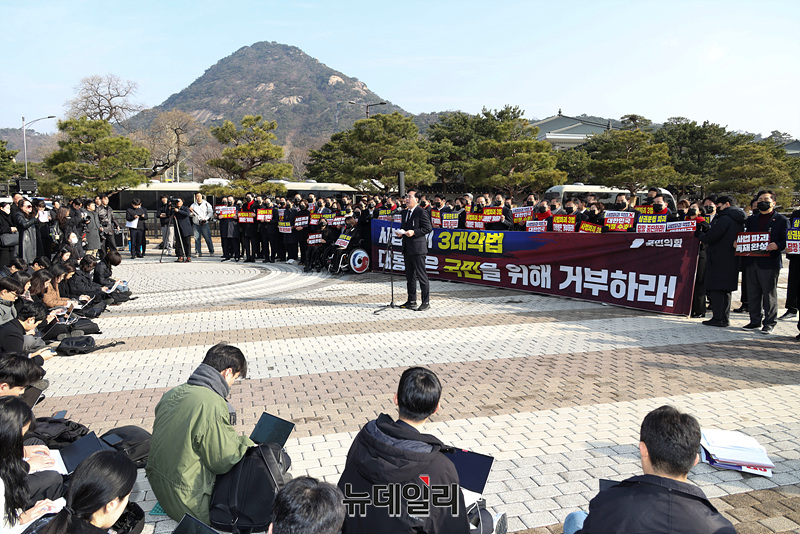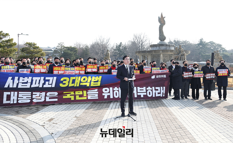 송언석 국민의힘 원내대표가 5일 오전 서울 종록 청와대 사랑채 분수대 앞에서 열린 '사법파괴 3대 악법 거부권 행사 촉구' 현장 의원총회에서 규탄 발언을 하고 있다.