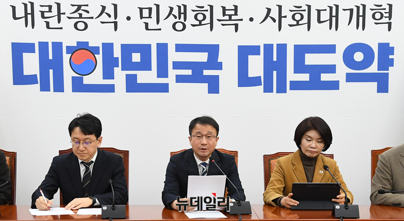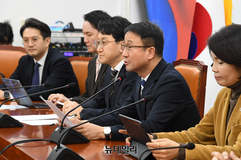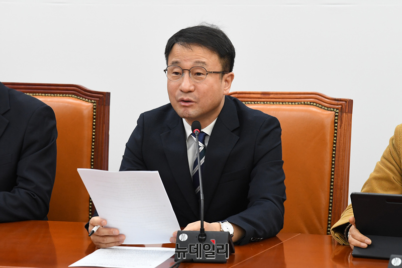한병도 더불어민주당 원내대표가 5일 오전 국회에서 열린 원내대책회의에서 모두발언을 하고 있다.