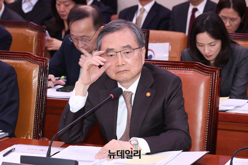 조현 외교부 장관이 6일 국회에서 열린 외교통일위원회 전체회의에서 안경을 고쳐쓰고 있다.