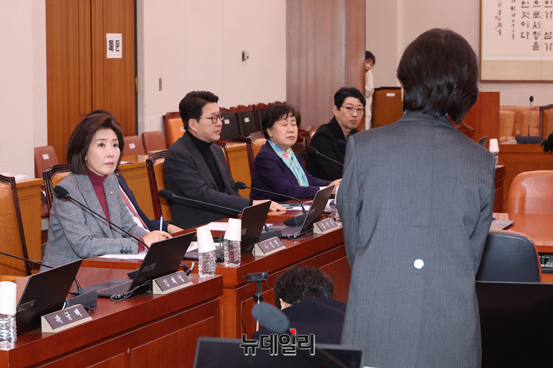 국회 법제사법위원회 국민의힘 의원들이 6일 오전 국회 법제사법위원회 전체회의실에서 '코로나19 백신 감사원 감사결과 긴급현안질의'를 위한 전체회의 개의를 요구하며 위원석에 앉아 있다.