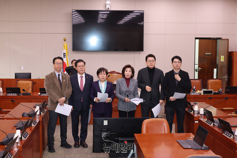 국회 법제사법위원회 나경원 국민의힘 의원 등 이 6일 오전 국회 법제사법위원회 전체회의실에서 '코로나19 백신 감사원 감사결과 긴급현안질의에 대한 추미애 법사위원장의 회피·지연 및 사법파괴 3대 악법 관련 기자회견'을 하고 있다.