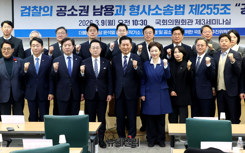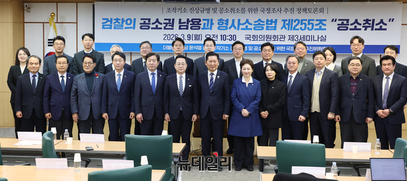 정청래 더불어민주당 대표가 9일 오전 국회 의원회관에서 열린 조작기소 진상규명 및 공소취소를 위한 국정조사 추진 정책토론회에서 박성준 국조추진위 부위원장 등 참석자들과 기념촬영하고 있다.