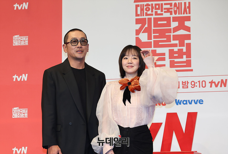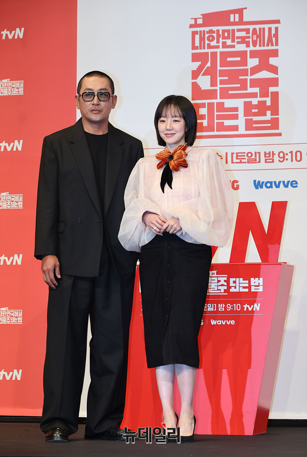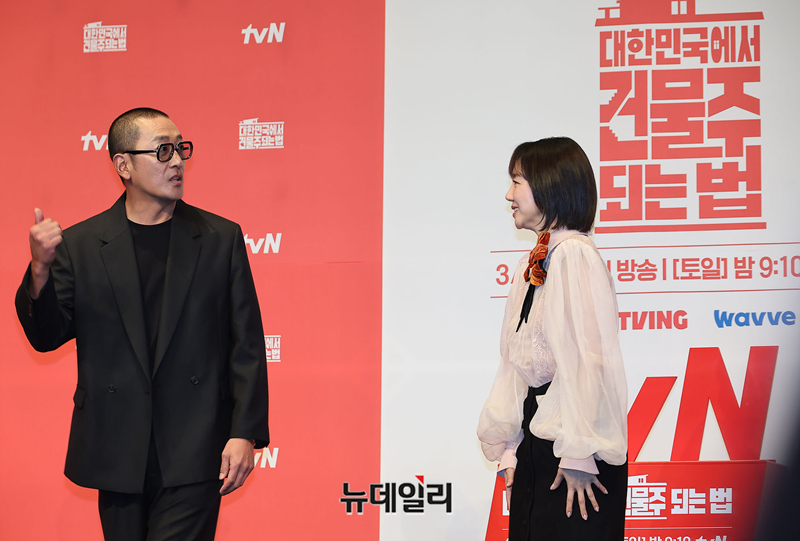 배우 하정우, 임수정이 9일 오후 서울 구로구 더링크호텔 서울에서 열린 tvN 드라마 '대한민국에서 건물주 되는 법(연출 임필성, 극본 오한기)' 제작보고회에서 포즈를 취하고 있다.'대한민국에서 건물주 되는 법'은 건물주가 되고 건물을 지키기 위해 처절하게 발악하는 흙수저 가장 기수종의 이야기로, 엄청난 빚더미를 떠안으며 건물주가 된 기수종 자신과 가족의 미래인 빌딩을 빼앗길 위해에 놓이며 발버둥 치는 이야기를 담았다.배우 하정우, 이수정, 김준한, 정수정, 심은경 등이 출연한다. 12부작으로 3월 14일 토요일 첫 방송.