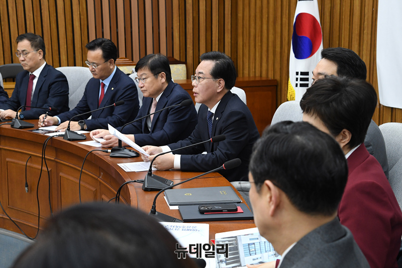 송언석 국민의힘 원내대표가 10일 오전 국회에서 열린 원내대책회의에서 모두발언을 하고 있다.