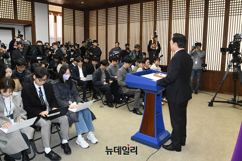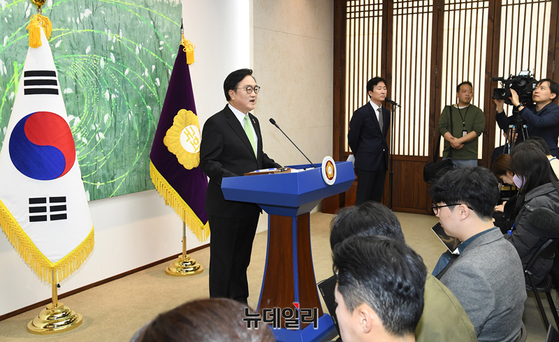 우원식 국회의장이 10일 오전 국회의장 접견실에서 열린 개헌 관련 긴급 기자회견에서 발언을 하고 있다.