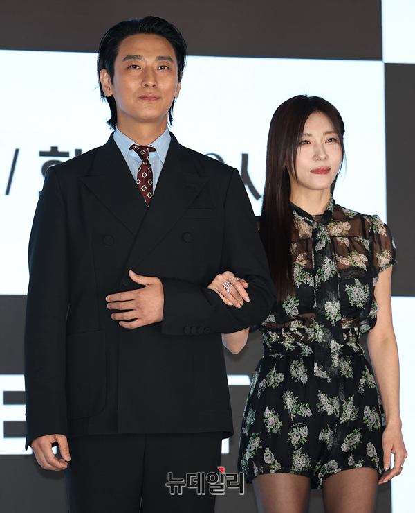 배우 주지훈, 하지원이 10일 오후 서울 구로구 디큐브아트센터에서 열린 ENA 월화드라마 '클라이맥스(연출 이지원)' 제작발표회에서 포즈를 취하고 있다.