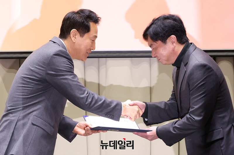 오세훈 서울시장과 배우 임원희가 11일 오전 서울시청에서 열린 2026년 유공납세자 표창장 수여식에서 기념촬영을 하고 있다.