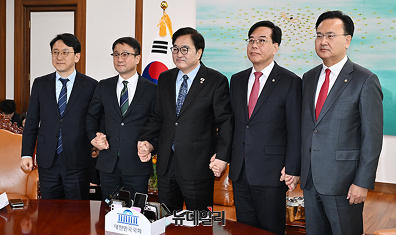 우원식 국회의장이 12일 국회에서 열린 의장 주재 여야 원내대표 회동에서 기념촬영을 하고 있다. (왼쪽부터 천준호 더불어민주당 원내운영수석부대표, 한병도 원내대표, 우 국회의장, 송언석 국민의힘 원내대표, 유상범 원내운영수석부대표)