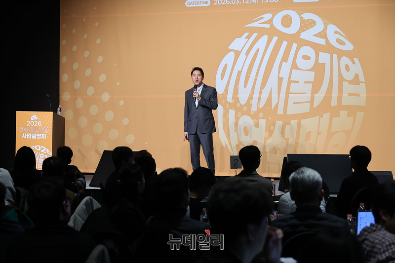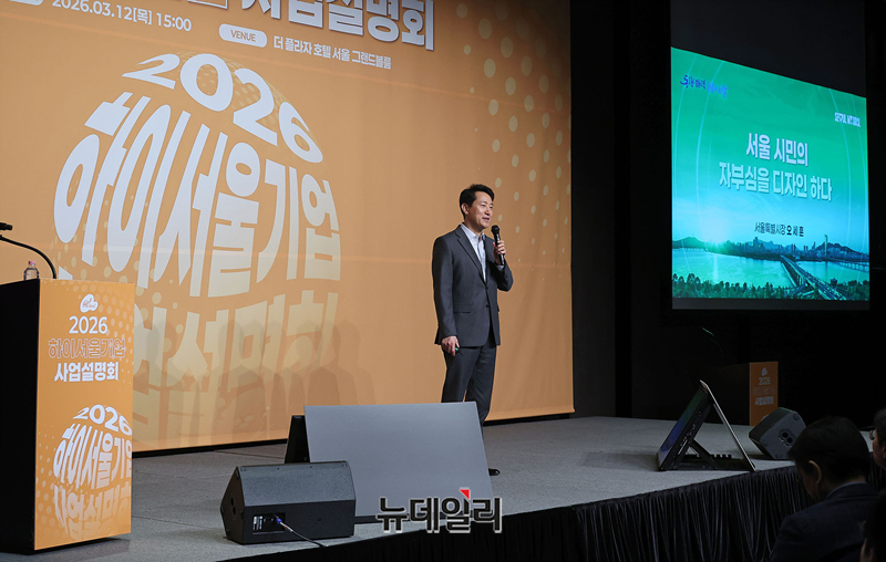 오세훈 서울시장이 12일 오후 서울 중구 더플라자호텔 서울에서 열린 2026 하이서울기업 사업 설명회에서 서울시정 특강을 하고 있다. 사업설명회는 386개사 553명이 참석해 비즈니스 협업피칭, 유관기관/SBA사업, 서울시정 특강 등으로 진행됐다.