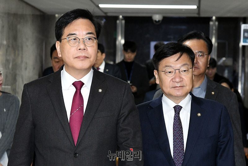 송언석 국민의힘 원내대표와 정점식 정책위의장 13일 오전 국회에서 열린 원내대책회의에 참석하고 있다.
