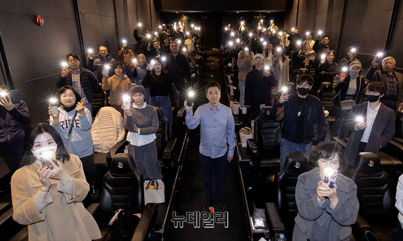김세의 가로세로연구소 대표와 회원들이 14일 오후 서울 강남구 청담씨네시티 CGV에서 고 김새론 유작 영화 '우리는 매일매일' 단체관람에 앞서 기념촬영을 하고 있다.
