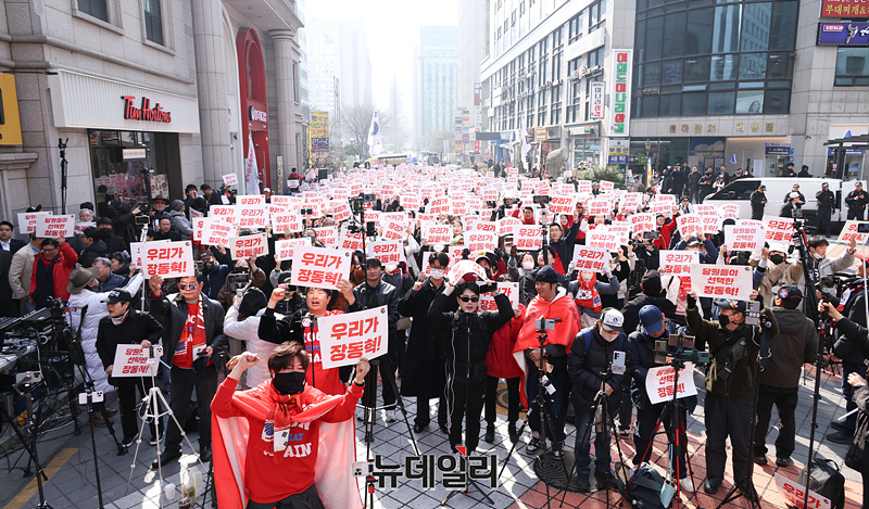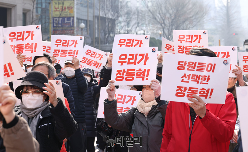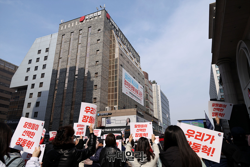 장동혁 국민의힘 대표를 지지하는 유튜버들과 지지자들이 16일 오전 서울 여의도 국민의힘 중앙당사 앞에서 집회를 열고 장 대표의 지지 구호를 외치고 있다.