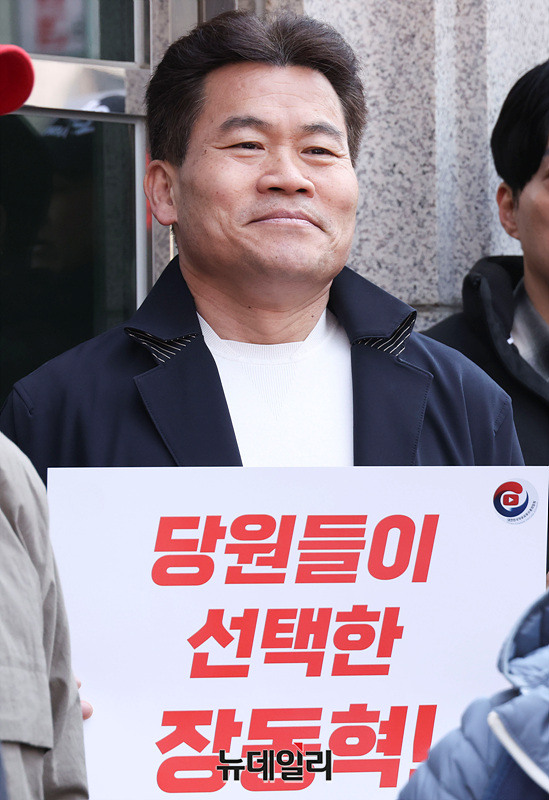 전한길 한국사 강사가 16일 오전 서울 여의도 국민의힘 중앙당사 앞에서 열린 장동혁 대표 지지 집회에 참석해 자리하고 있다.