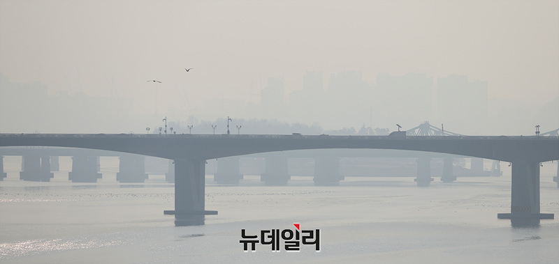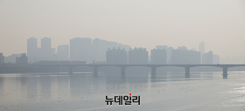 중국 북동부에서 발생한 산불 먼지와 대기 정체로 인해 비상저감조치가 발령된 17일 오전 서울 한강에서 바라본 건물들이 뿌옇게 보이고 있다. 내일은 전국에 비가 내린뒤 맑아질 전망이다.
