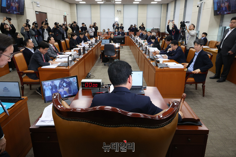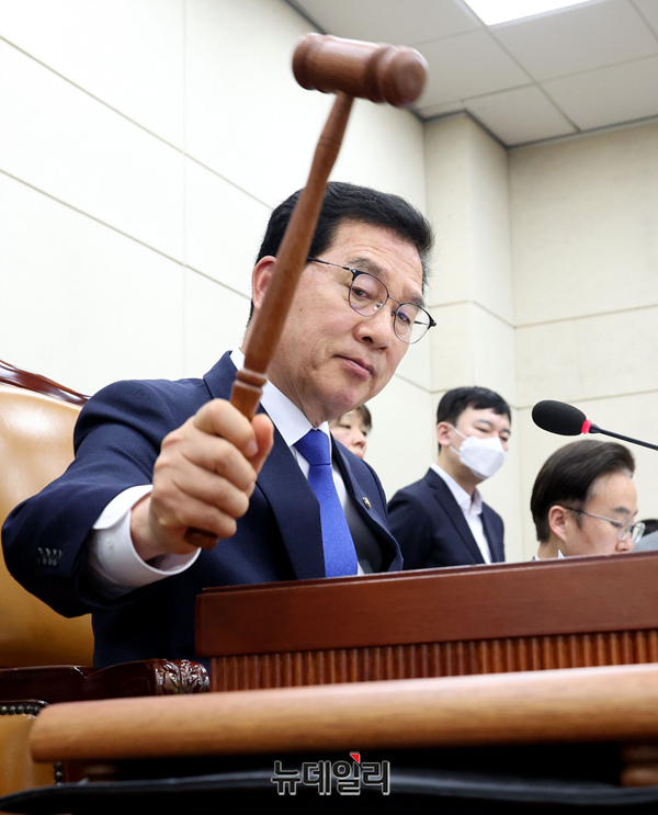 신정훈 국회 행정안전위원장이 18일 오전 국회에서 열린 행안위 전체회의에서 의사봉을 두드리고 있다. 이날 중대범죄수사청 설치법이 더불어민주당 주도로 통과됐다.