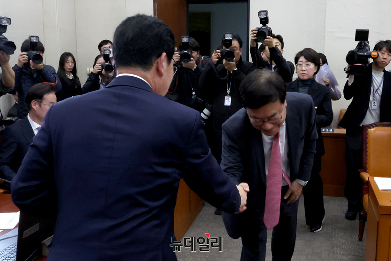 신정훈 국회 행정안전위원장이 18일 오전 국회에서 열린 행안위 전체회의에서 중대범죄수사청 설치법 통과 후 산회 뒤 서범수 국민의힘 의원과 악수를 나누고 있다.