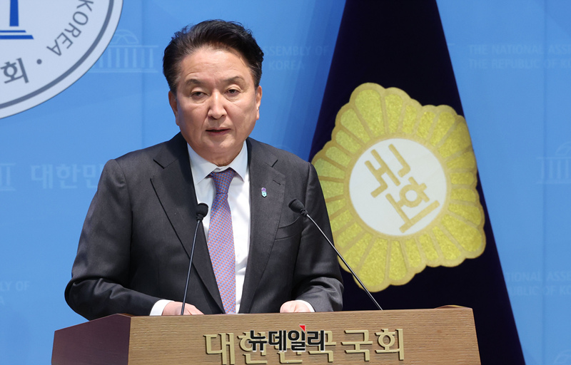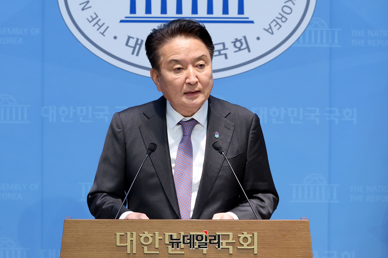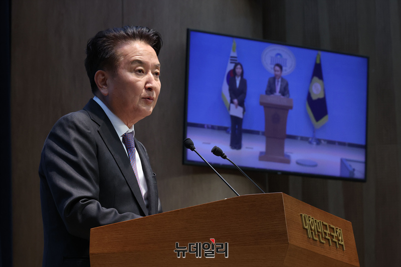 김영환 충북지사가 18일 국회 소통관에서 국민의힘 공천관리위원회가 본인을 공천 배제·경찰의 금전 수수 혐의 구속영장을 신청 관련 기자회견을 하고 있다.