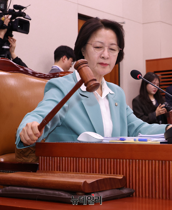 추미애 국회 법제사법위원장이 18일 국회에서 열린 법제사법위원회 전체회의에서 의사봉을 두드리고 있다.