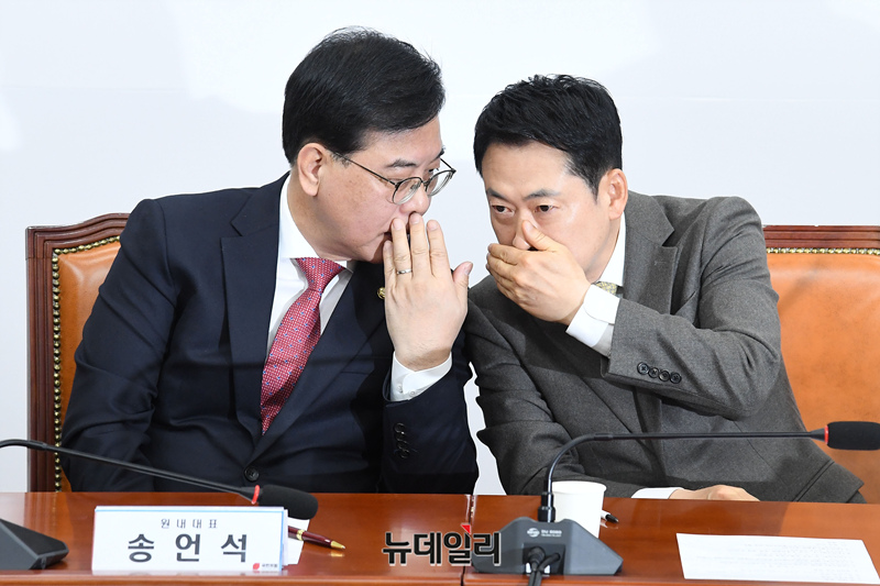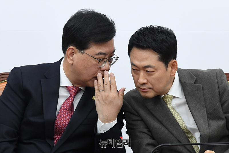 장동혁 국민의힘 대표가 19일 오전 국회에서 열린 최고위원회의에서 송언석 원내대표와 대화를 나누고 있다.