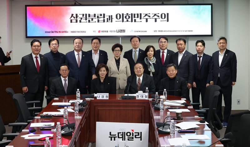 나경원 국민의힘 의원과 정대철 대한민국헌정회장 등 참석자들이 19일 오전 국회 의원회관에서 열린 '삼권분립과 의회민주주의' 세미나에서 기념촬영을 하고 있다.