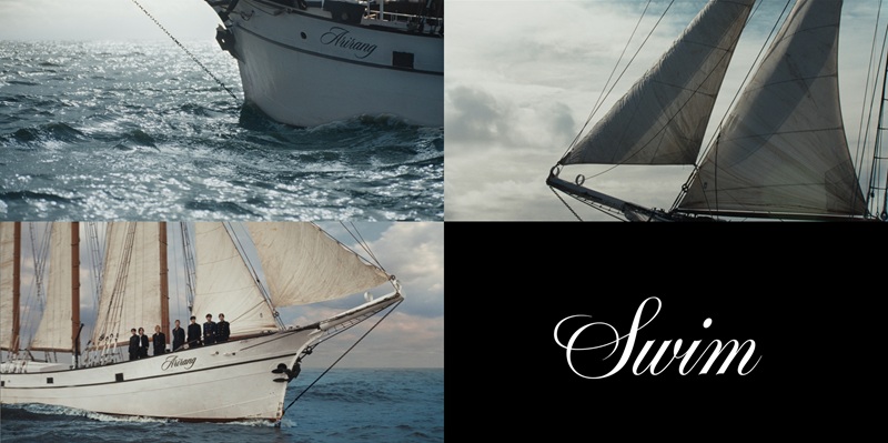 방탄소년단은 19일 0시 공식 SNS 및 유튜브 채널에 신보 '아리랑'의 타이틀곡 'SWIM' 뮤직비디오 티저 영상을 추가 공개했다. 지난 18일 선보인 첫 티저가 박물관에 전시된 배 모형을 바라보는 여성으로 호기심을 자극했다면, 이번에는 방탄소년단 일곱 멤버가 온전히 모습을 드러냈다. 영상은 'SWIM' 음원을 배경으로 바다를 가르며 나아가는 흰 범선의 뱃머리를 비추며 시작된다. 거대한 배 위에 나란히 선 이들은 흔들림 없이 정면을 응시한다. 한 편의 영화 같은 웅장한 연출과 멤버들의 단단한 기세는 본편에 대한 기대감을 최고조로 끌어올린다.