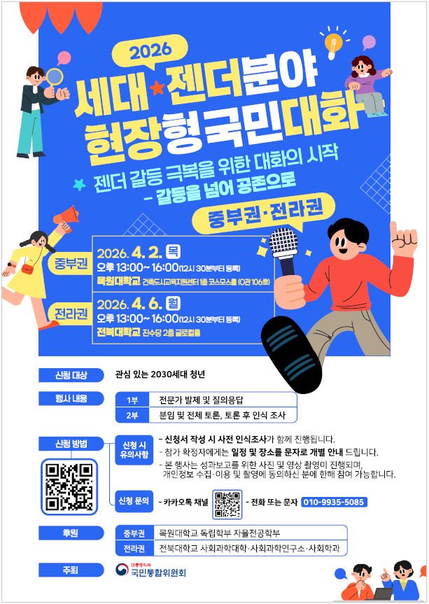 관심 있는 2030세대 청년은 누구나 사전등록을 통해 현장형 국민대화에 참여할 수 있으며, 자세한 내용은 통합위 홈페이지와 온라인 신청링크를 통해 확인할 수 있다.