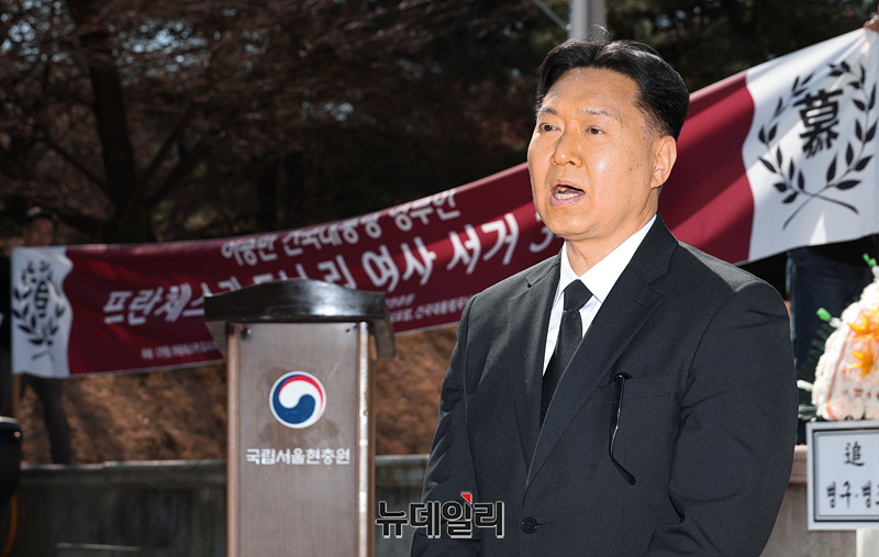 이승만 대통령 손자 이병구 이화장 대표가 19일 오전 서울 동작구 국립서울현충원 이승만대통령 묘역에서 열린 3. 19 프란체스카 도너 리 34주기 추모식에서 발언하고 있다.