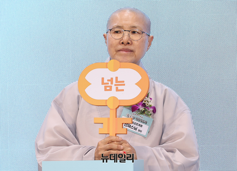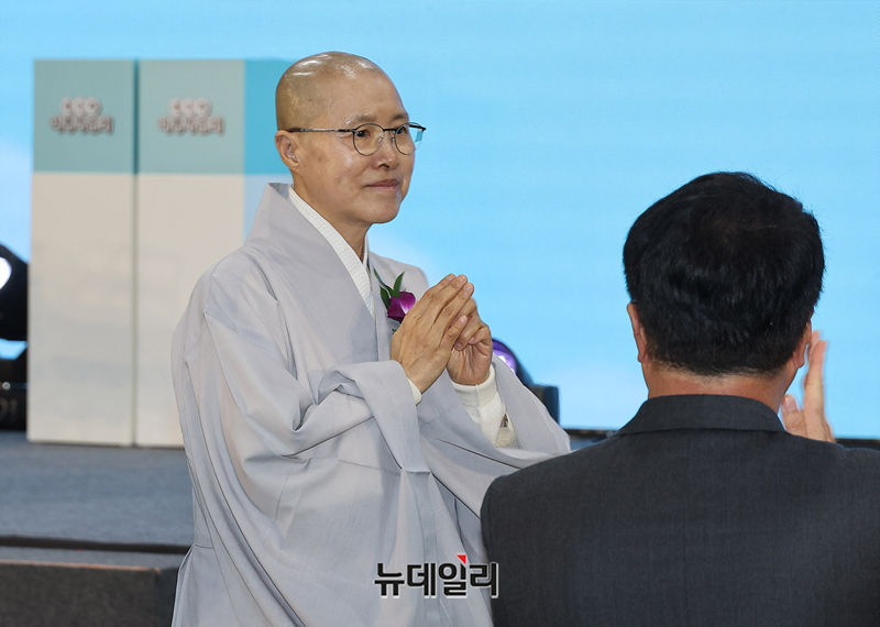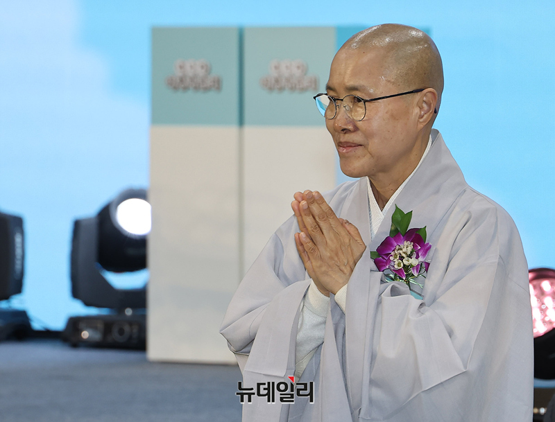 사찰음식 명장 선재 스님이 19일 오후 서울 강서구 코엑스 마곡에서 열린 2026 내나라 여행박람회 개막식에서 합장하고 있다.