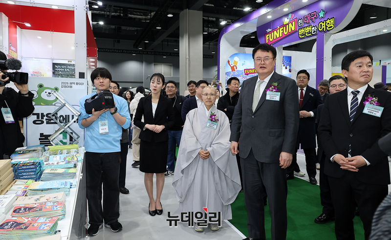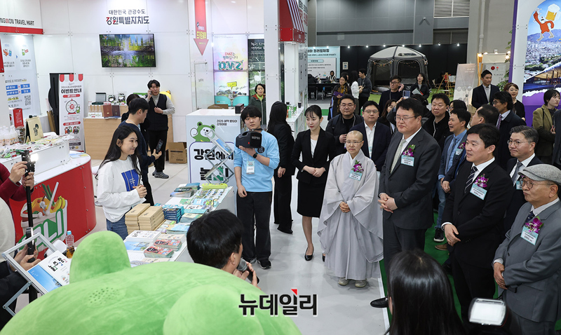 김대현 문화체육관광부 차관, 이경수 한국관광협회중앙회장, 선재 스님 등 주요 내빈들이 19일 오후 서울 강서구 코엑스 마곡에서 열린 2026 내나라 여행박람회 개막식에서 강원특별자치도 부스를 찾아 관람을 하고 있다.