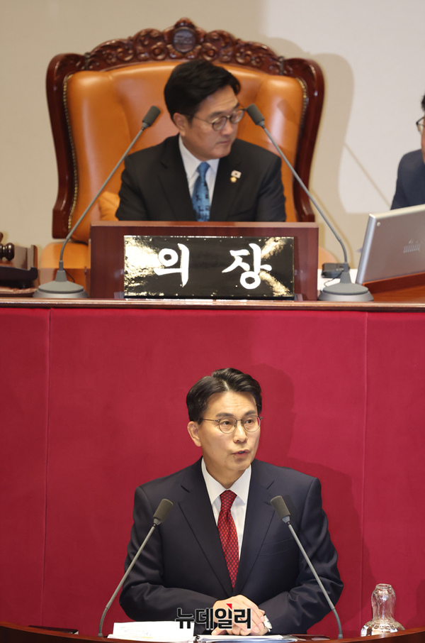 윤상현 국민의힘 의원이 19일 국회에서 열린 본회의에서 공소청법안에 대한 무제한토론을 하고 있다.