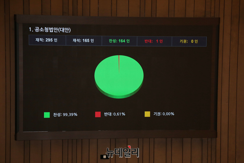 [포토] 찬성 164명 반대 1명, 공소청법안 가결