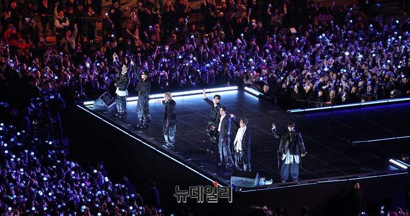 3년 9개월 만에 완전체로 복귀하는 방탄소년단(BTS)의 'BTS 컴백 라이브: ARIRANG' 공연이 21일 서울 광화문광장 일대에서 펼쳐지고 있다. 이번 공연은 세계 190개국에 생중계된다. (사진=공동취재단)