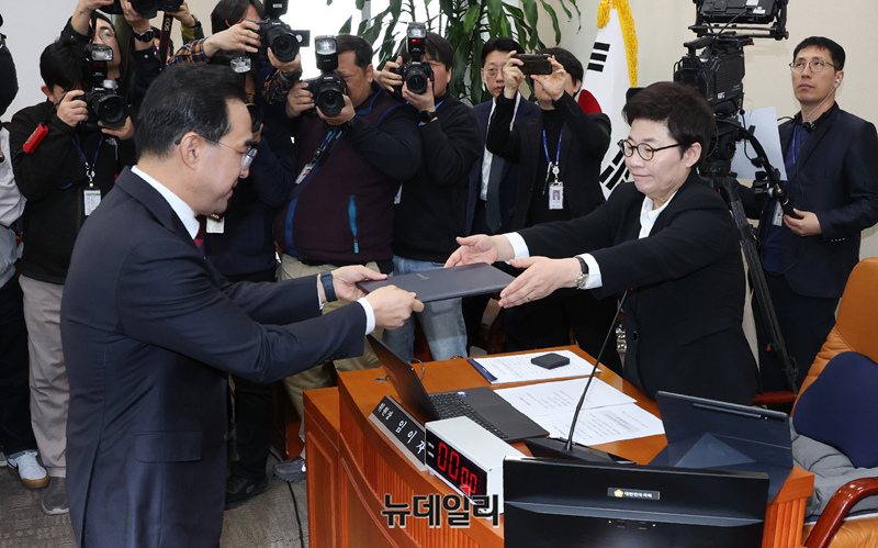 박홍근 기획예산처 장관 후보자가 23일 오전 국회 재정경제기획위원회에서 열린 인사청문회에서 임이자 위원장에게 선서문을 제출하고 있다.