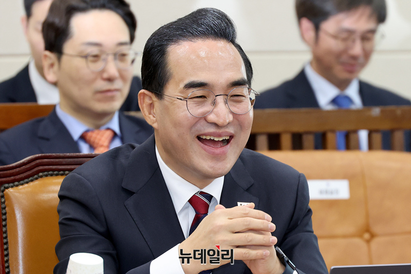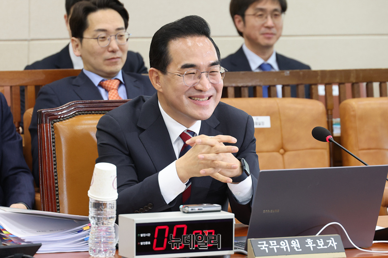 박홍근 기획예산처 장관 후보자가 23일 오전 국회 재정경제기획위원회에서 열린 인사청문회에서 환하게 웃고 있다.