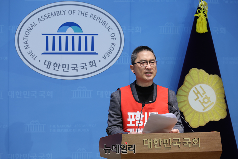 포항시장 공천에서 컷오프된 김병욱 전 국회의원은 23일 국회 소통관에서 기자회견을 갖고 중앙당 공천관리위원회의 불공정한 경선 후보 선정에 항의하며 무기한 단식 투쟁에 돌입한다고 밝히고 있다.