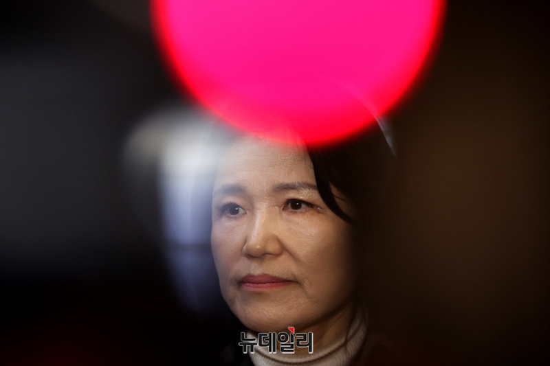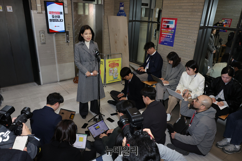 국민의힘 대구시장 후보 경선에서 컷오프된 이진숙 전 방송통신위원장이 24일 서울 여의도 국민의힘 중앙당사에서 경선 결과 관련 기자회견을 갖고 있다.