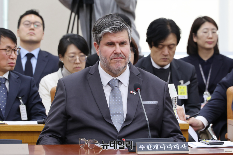 필립 라포튠 주한캐나다대사가 24일 국회에서 열린 국방위원회 전체회의에서 대한민국과 캐나다간 국방·방산 협력 확대를 위한 결의안 가결을 지켜보고 있다.