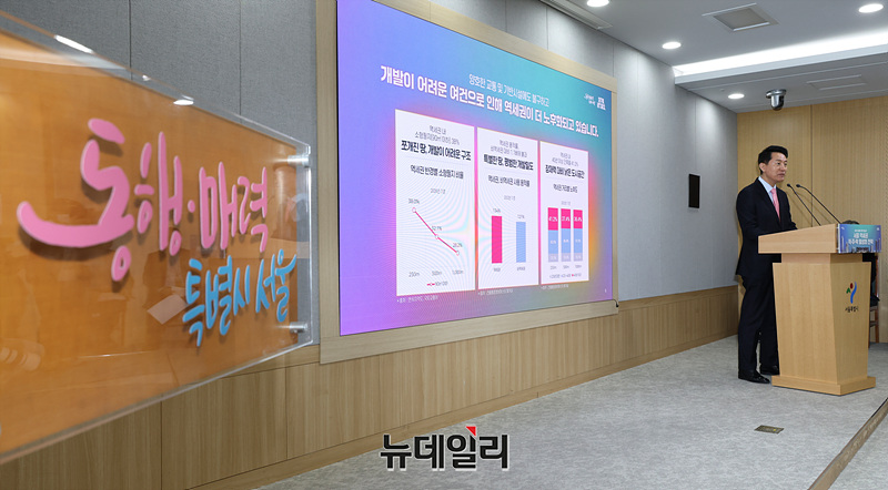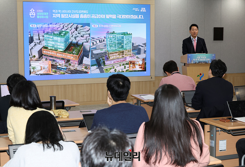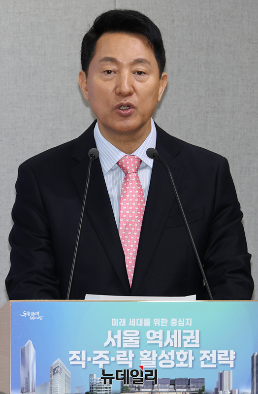 오세훈 서울시장이 25일 오전 서울 중구 서울시청에서 열린 '서울 역세권 직주락 활성화 전략 기자설명회'에서 발표하고 있다.