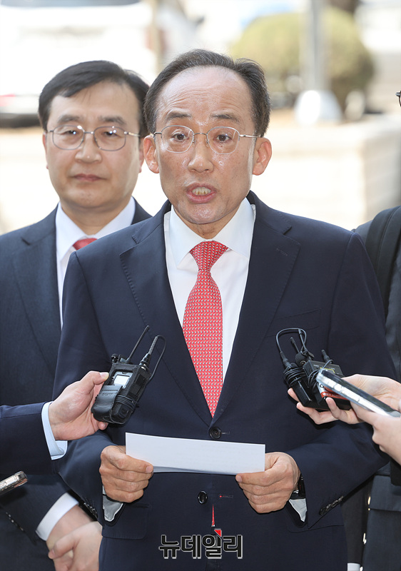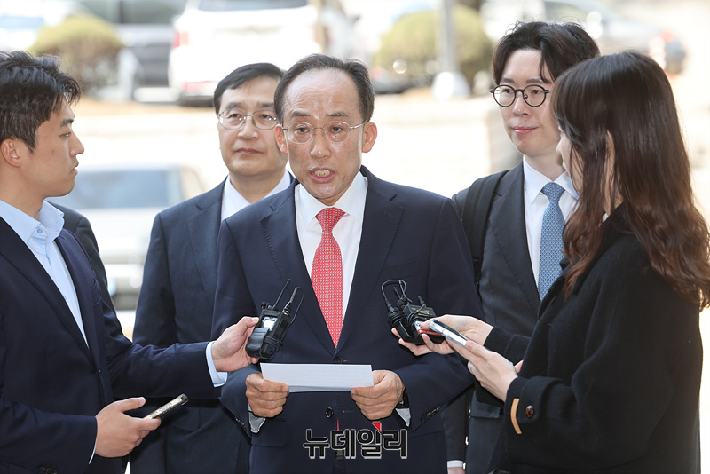 12·3 비상계엄 당시 의원들의 계엄 해제 표결 참여를 방해한 혐의를 받는 추경호 국민의힘 의원이 25일 오후 서울 서초구 서울중앙지법에서 열린 내란 중요임무 종사 혐의 1심 첫 공판에 출석하고 있다.