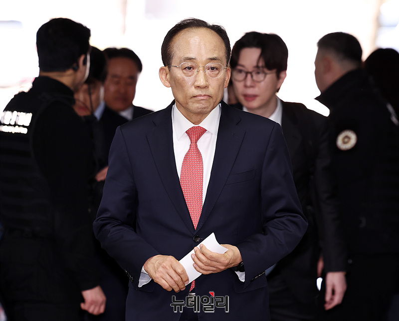 12·3 비상계엄 당시 의원들의 계엄 해제 표결 참여를 방해한 혐의를 받는 추경호 국민의힘 의원이 25일 오후 서울 서초구 서울중앙지법에서 열린 내란 중요임무 종사 혐의 1심 첫 공판에 출석하고 있다.