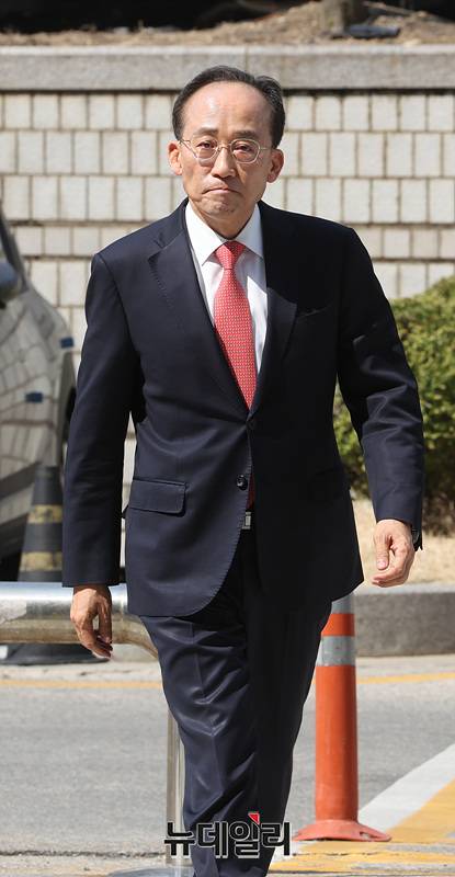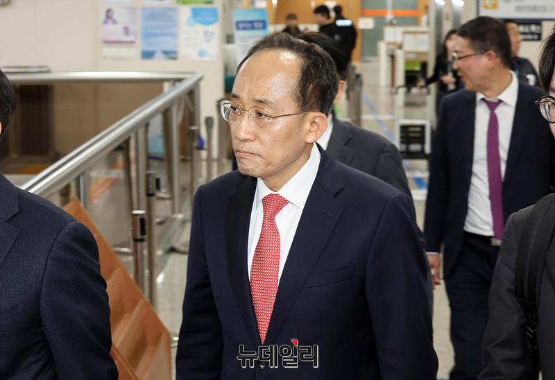 12·3 비상계엄 당시 의원들의 계엄 해제 표결 참여를 방해한 혐의를 받는 추경호 국민의힘 의원이 25일 오후 서울 서초구 서울중앙지법에서 열린 내란 중요임무 종사 혐의 1심 첫 공판에 출석하고 있다.