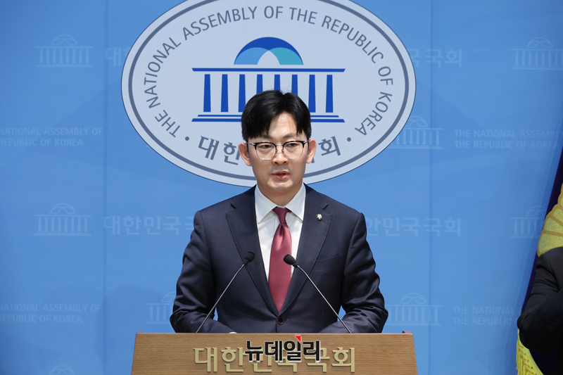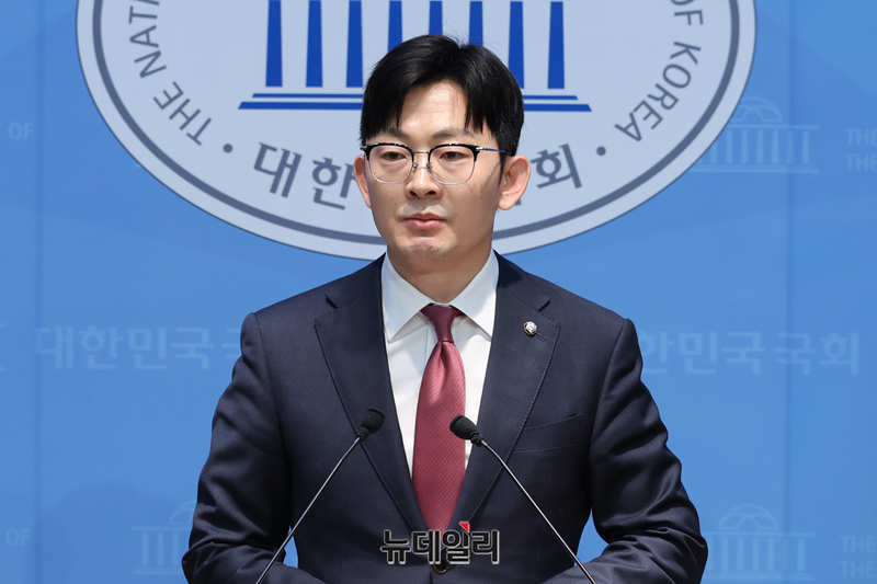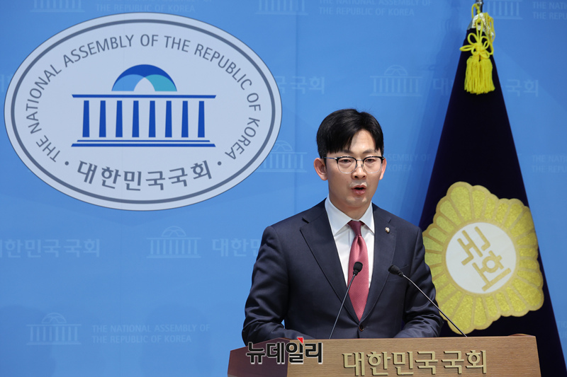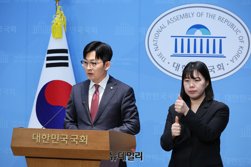 박충권 국민의힘 원내수석대변인이 25일 오전 국회 소통관에서 ▲북한엔 굴종, 국민엔 독주 이재명 정부의 내로남불의 민낯 ▲민주당, 이재명 대통령 입법 방탄 정치 보복 쇼 멈춰라 관련 논평 온마이크를 하고 있다.