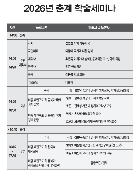 본 세션은 제2부(미중 패권 경쟁과 동북아 국제정치 및 경제안보 전망)와 제3부(한국의 대외 전략과 중견국 연대의 필요성)로 구성된다.'미중 패권구도 하 동북아 국제정치 전망'(제2부)에 대해서는 김재천 교수가 발제자로 나서 트럼프 2기 행정부의 거부 전략(Strategy of Denial)과 역외 균형(Offshore Balancing) 기조를 중심으로 동북아 안보 환경 변화를 분석한다. 토론에서는 전재성 서울대 정치외교학부 교수가 미중 경쟁의 구조적 성격과 함께 중동 지역 변수 등 국제정세의 복합적 요인을 짚을 예정이다.'미중 전략 경쟁 하 동북아 경제안보 관계 전망'(제2부)에 대해서는 유지영 교수가 발제자로 나서 한국의 대중 의존 구조와 미국의 수출통제 정책이 국내 산업에 미치는 영향을 분석한다. 최병일 이화여대 국제대학원 명예교수는 토론을 통해 한국의 대응전략을 제시할 계획이다.제3부에서는 이상현 세종연구소 연구위원이 '미중 패권경쟁과 한국의 대외전략'을 주제로 국제질서의 변화 속에서 동맹 강화와 전략적 자율성 확보의 병행 필요성 등을 발표한다. 이신화 고려대 정치외교학과 교수는 토론자로 나서 동맹, 헤징, 중견국 협력 전략의 재구성 방향을 중심으로 논의를 진행할 예정이다.건국정신과미래학회는 대한민국의 정체성과 헌법적 가치를 기반으로 학술 연구 및 정책 제안을 수행하고 있으며, 이번 세미나를 통해 도출된 논의를 향후 대외 정책 제안으로 발전시켜 나갈 계획이다.