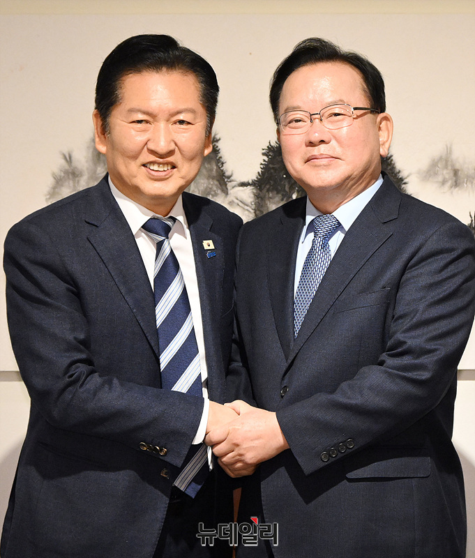 정청래 더불어민주당 대표와 김부겸 전 국무총리가 26일 오전 서울 중구 달개비에서 회동 전 손을 맞잡고 있다. (사진=국회사진기자단)