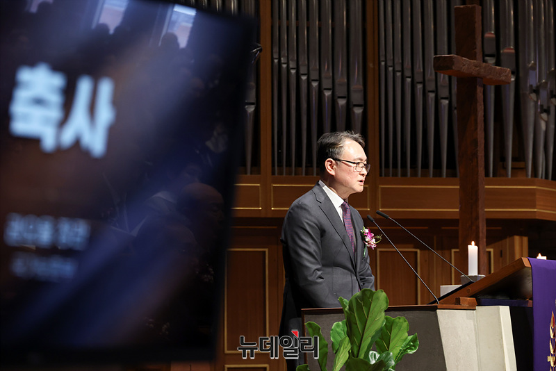이승우 서울지방보훈청장이 26일 오후 서울 중구 정동제일교회에서 열린 이승만 건국대통령 탄신 151주년 기념식에서 권오을 보훈부장관 축사를 대독하고 있다.